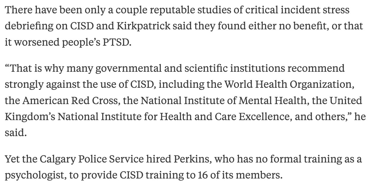 But if you’re ready to dive in, be ready for emerging evidence that Calgary Police Service introduced potentially harmful PTSD treatment practices to its staff and seemingly worked with CPS Commission to minimize the public fallout through a truncated report. This provided minimal details but suggested that CPS treatment practices lacked religious neutrality. How and whether police seek treatment for PTSD has serious implications for the safety of citizens during police encounters, given the potential for escalating violent responses to perceived dangers. Have corrective measures been put in place, and have those responsible been prevented from causing further harm?