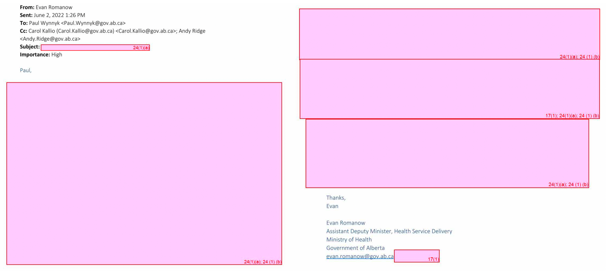 Keeping in mind this is information directly concerning me, some of the redactions in the 190 pages were entirely absurd, such as this email from the Deputy Minister: