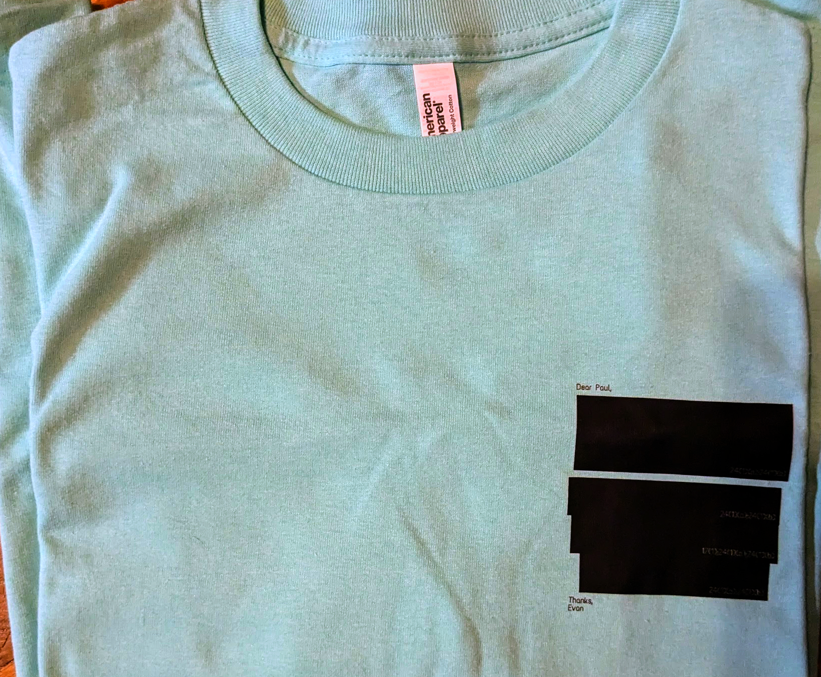 Morbidly amused by this perversion of privacy law, a friend turned the exchange into a t-shirt: