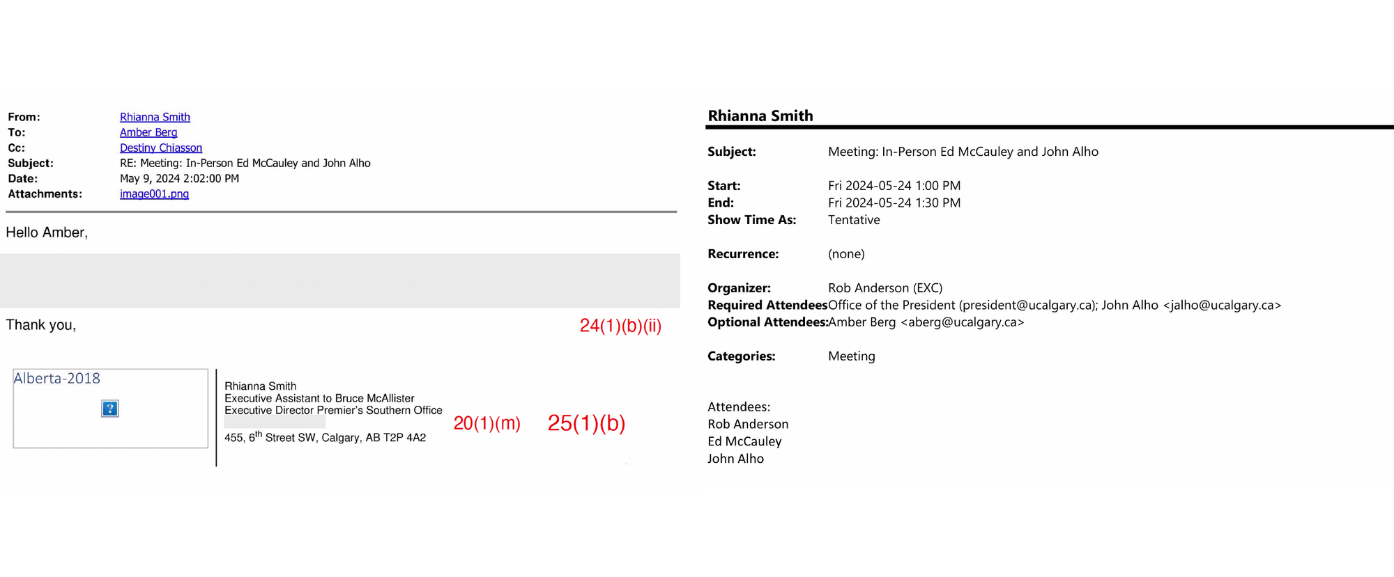 This revealed that the two offices were in direct contact on May 9. At 2PM that day, six hours before the riot squad arrived on University grounds, the Premier's office set a May 24 in-person visit with the University President and Vice President Government Relations. The text of the email from the Premier's office was redacted under Section 24(1)(b)(ii), "consultations or deliberations involving a member of the Executive Council" – in this case, the Premier.