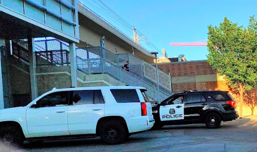 The officer chasing him can be heard asking us if the arrestee went up the ramp. Following him to the front of the building, we could see he lost track of the arrestee.