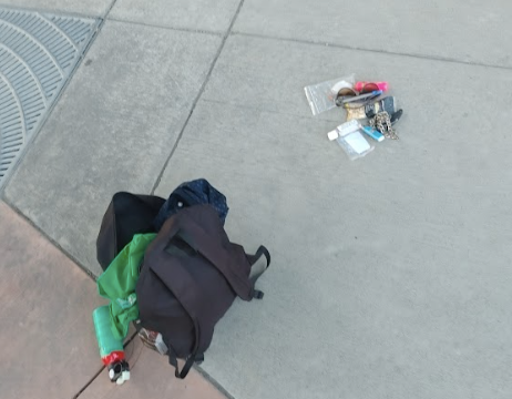 I photographed the contents of the person's backpack. Note that a can of bear mace was found in the backpack, which could be considered a weapon under local law. Otherwise, there was nothing that could pose a significant threat to public safety. A baggie with a tiny amount of unknown substance, possibly methamphetamine, was visible among the items.