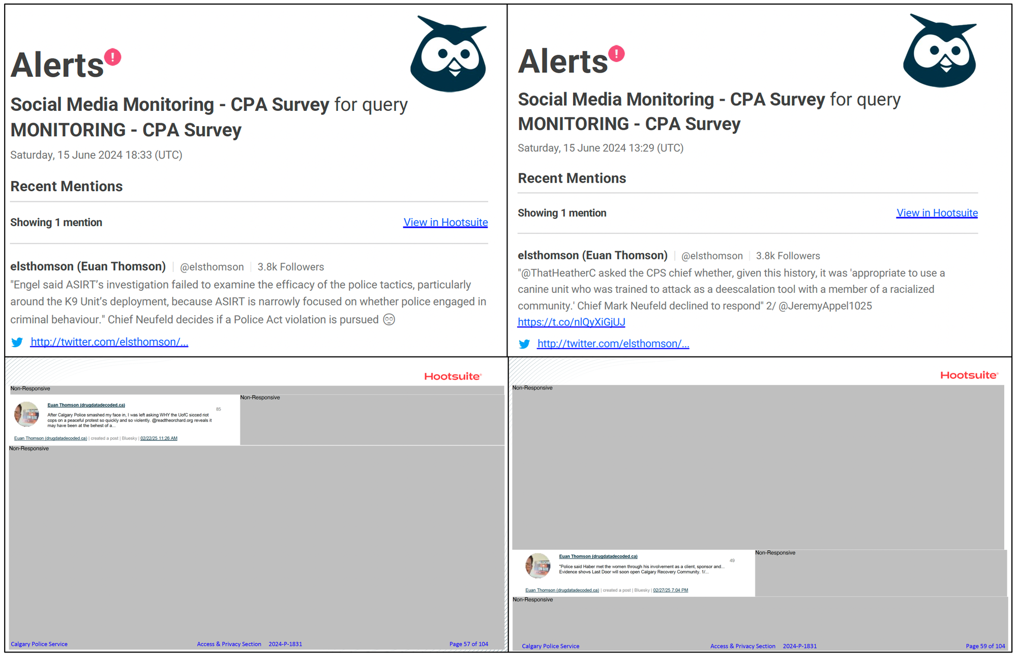 CPS insists that Hootsuite data collection is not connected to investigations, likely placing this surveillance at odds with federal, provincial and internal regulations. Nonetheless, Hootsuite alerts of this author's social media posts began less than four weeks after the trespass charge was issued. The alerts also persisted after February 13, 2025, when the Trespass charge was withdrawn by the Crown and during a separate period in June, during which the Trespass charge was not technically active.