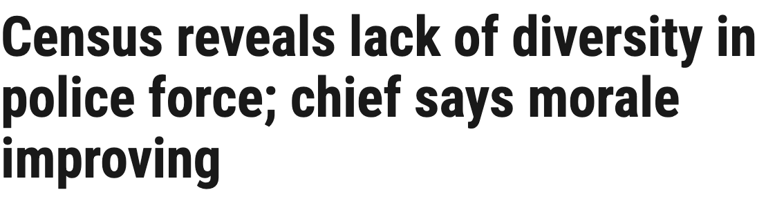 When police services conduct their own workplace census, media should treat these primarily as propaganda exercises to smooth out mismatches between data and the "progressive" perception these services are keen to convey to the public. The visual techniques are readily visible on the front pages of existing reports.
