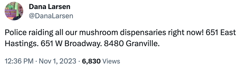 At the time of writing, we are unaware if it is only Larsen’s shops that have been raided, or whether the multiple other magic mushroom shops in Vancouver have shared the same fate. (Update Nov 2, 8:04AM MST: Global BC reports the only shops raided on November 1 were shops owned by Dana Larsen. He is outspoken in his support for DULF, offering to match donations made to the organization in the wake of the October 25 arrests.)