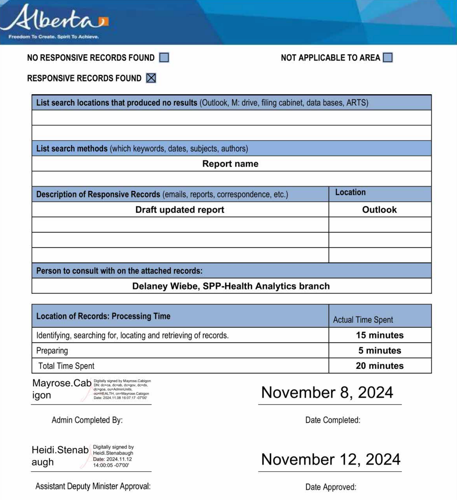 Despite internal documents revealing that the Ministry of Health located the 48-page document by November 8, its January 6 FOIP response insisted that "Alberta Health conducted a thorough search for records and found no responsive records related to the subject matter." The Ministry then suggested that the records might be held by the Ministry of Mental Health and Addiction and offered to transfer the request to that ministry.