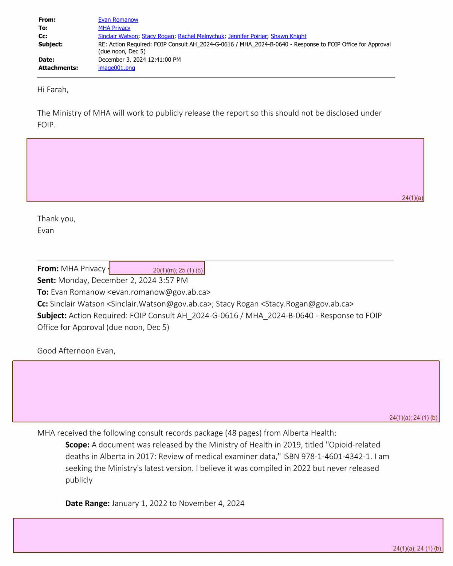 Deputy Minister of Mental Health and Addiction Evan Romanow told the Ministry's Privacy department on December 3 that "the Ministry of MHA will work to publicly release the report so this should not be disclosed under FOIP." This was two days before the initial FOIP deadline and a month before the Ministry of Health stated it held "no responsive records," despite clearly holding the records.