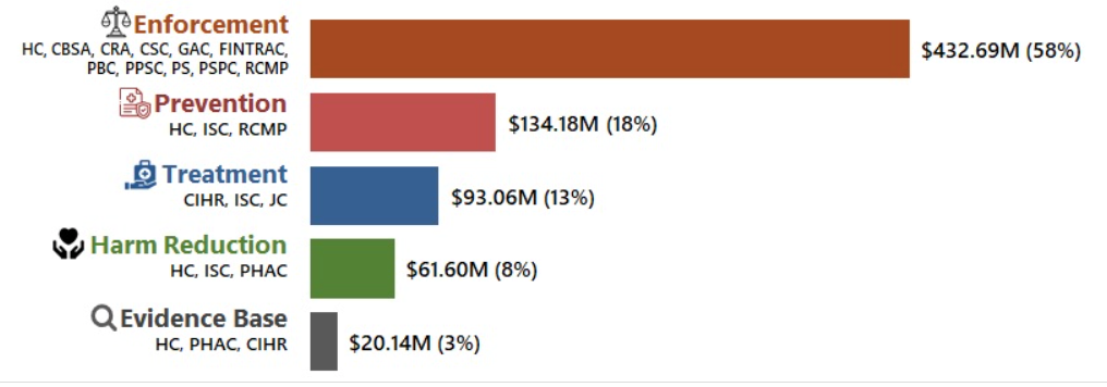 This would be a good place for a pie chart on Alberta's drug policy spending, but there simply isn't data to build one. At the national level, a report was produced in August 2023 that showed a breakdown of federal spending on the various pillars, but these amounts pale in comparison to what the provinces spend – let alone what cities allocate to policing.