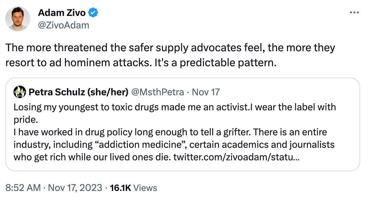Zivo takes it a step further, personally naming Zoë Dodd and me among the ”safer supply advocates [who] want to smear addiction doctors as corrupt simply because they work in, and thus earn a living from, their own field.”