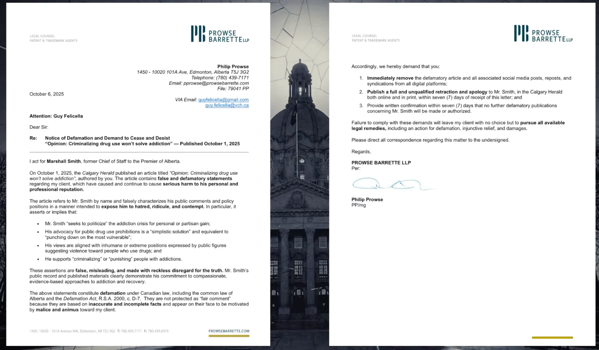 The Calgary Herald quietly unpublished an opinion piece written by Vancouver-based harm reduction and recovery advocate Guy Felicella after Felicella received a cease-and-desist defamation letter from a lawyer representing Marshall Smith, the former chief of staff to the premier of Alberta and architect of Alberta's abstinence-focused drug policy framework.