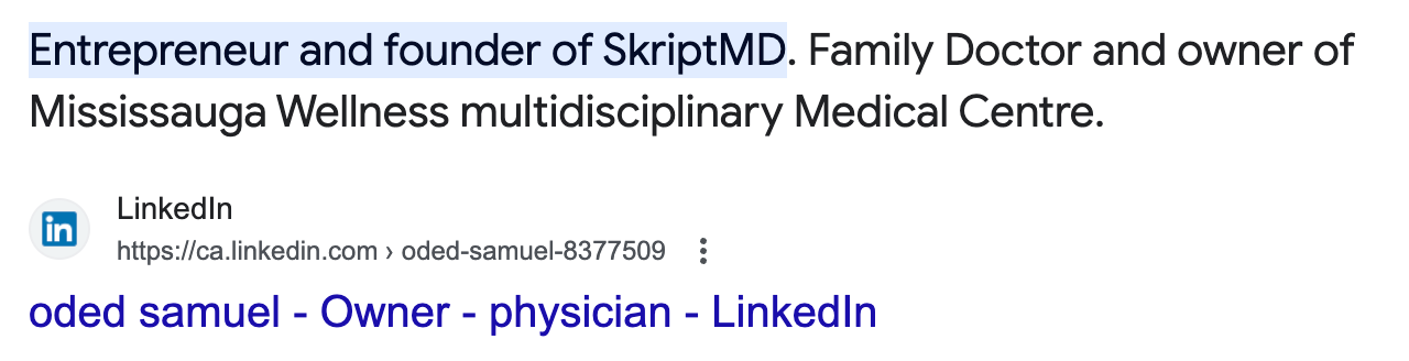 Although it’s not disclosed on the company website, Dr. Oded Samuel appears to be the owner and founder of SkriptMD, a virtual prescribing company. His LinkedIn profile does not directly show this, but a web search of his name and the company name reveals the following: