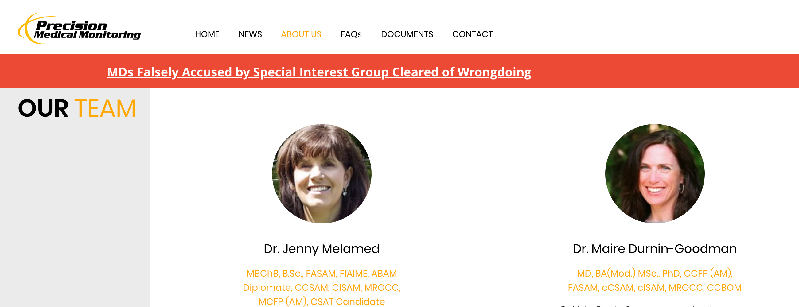 Next, letter signatories Dr. Jennifer Melamed and Dr. Maire Durnin-Goodman co-own Precision Medical Monitoring, while Dr. Alan Brookstone works there as Program Administrator. It’s a company that conducts — you guessed it — urine screening and treatment.