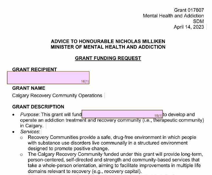 Alberta's Ministry of Mental Health and Addiction awarded the Calgary Recovery Community contract after just a two-week application window in 2023 but is withholding the recipient's identity and key contract details nearly two years later, in a heavily redacted freedom of information response to Drug Data Decoded.