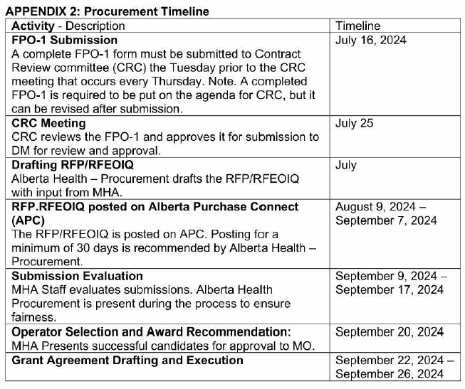 According to un-redacted portions of the freedom of information disclosure (available to media on request), the contract was announced through invitations sent to select service providers on March 1, 2023. Interested service providers signed a non-disclosure agreement, after which they received the application package. The applications required operational details, a budget and supporting stakeholder letters, due on March 15 – just two weeks after the initial invitation. The successful applicant was to be notified on March 31, 2023.