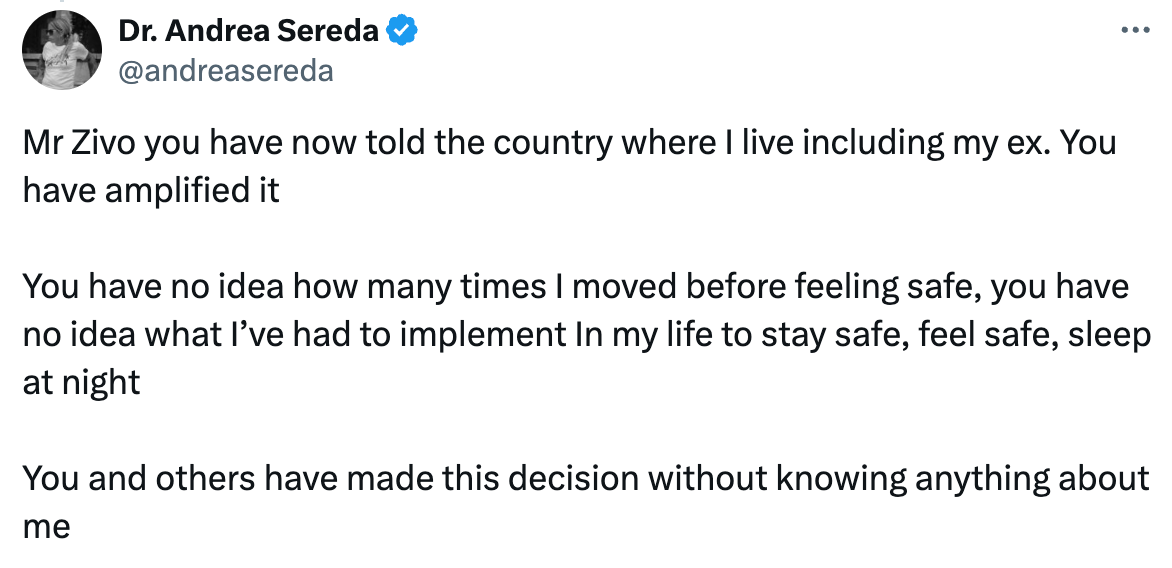 Zivo is expanding the margins of permissibility: first, he wrote national columns calling Sereda out by name, though she is just one of many safe supply-prescribing physicians. Next, he showed up at her clinic, harassing patients and even providing identifying information on one. Now, he's sharing where she lives and providing information about her child. The next toe over the line is someone showing up in her town, and it is terrifying to ponder what follows that.