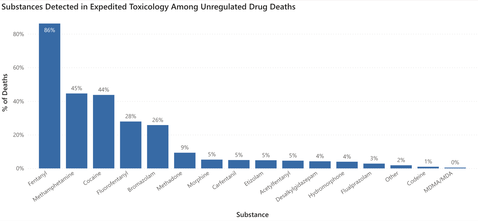 Fentanyl was detected in 79% and stimulants in 55% of deaths, reflecting broader population trends.