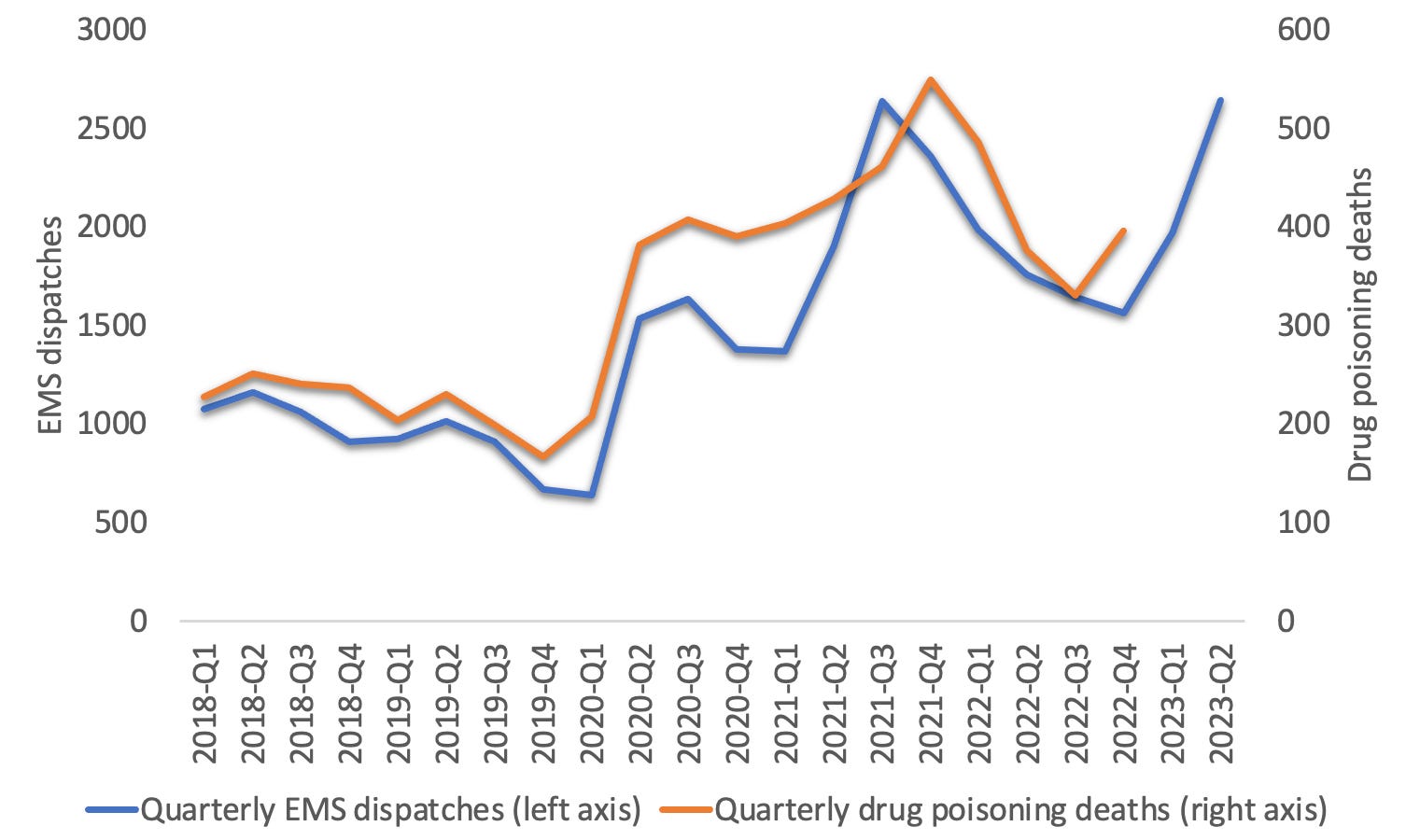 BC appears to be on a downtrend in drug poisoning deaths that coincides with the decriminalization of simple possession that began on January 31. Source: BC Unregulated Drug Deaths Summary. We know that overdoses increase in the weeks following a police bust, so it is possible that the downtrend that began in February follows decriminalization of minor drug possession. I’ll warn that it’s too early to say if these are linked, but for comparison, Alberta is seeing a sharp increase in drug poisonings over the same period, with decriminalization nowhere in sight. In Alberta, quarterly EMS dispatches increased 33% in Q1 and 20% in Q2 over previous quarters. We have yet to see Alberta mortality data for February through May, but people paying attention to this are bracing for hard news, because we know how closely EMS calls track mortalities.