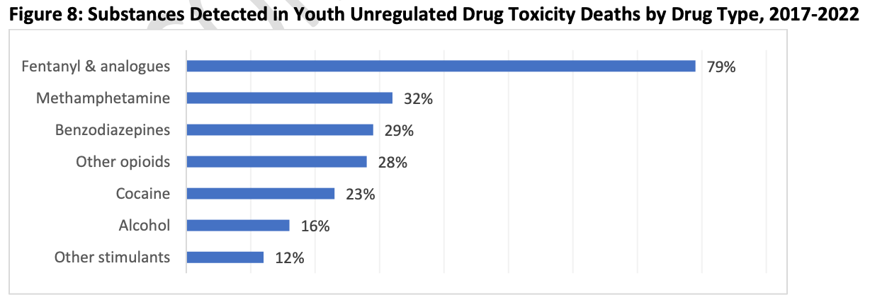 There were 36 drug toxicity deaths among people under 19 in 2022, which represents 1.6% of all drug toxicity deaths.