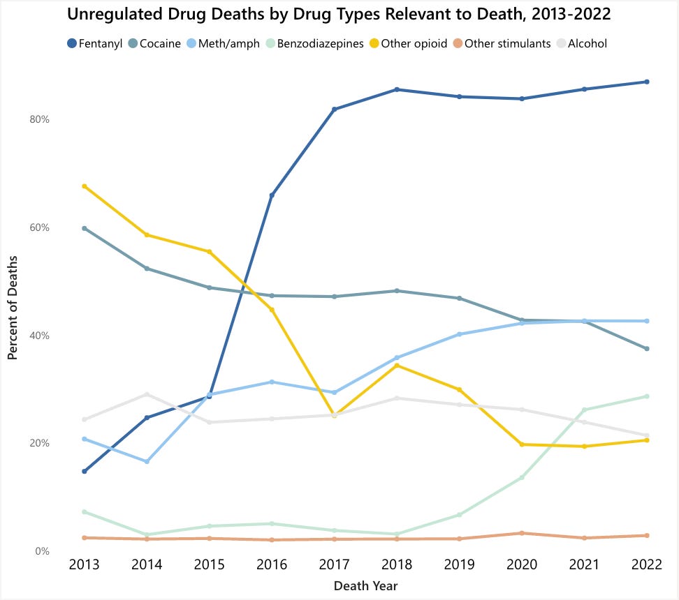 Alberta could be in a new peak of drug poisoning deaths after years spent closing supervised consumption sites, safe supply access and options for people who use drugs. Fentanyl reached an all-time high for relevant involvement with drug deaths at 86.9% in 2022, which appears to hold in 2023. Meanwhile, “Other opioids” including hydromorphone have bottomed out in relevance to drug deaths at around 20% after a 10-year decline.