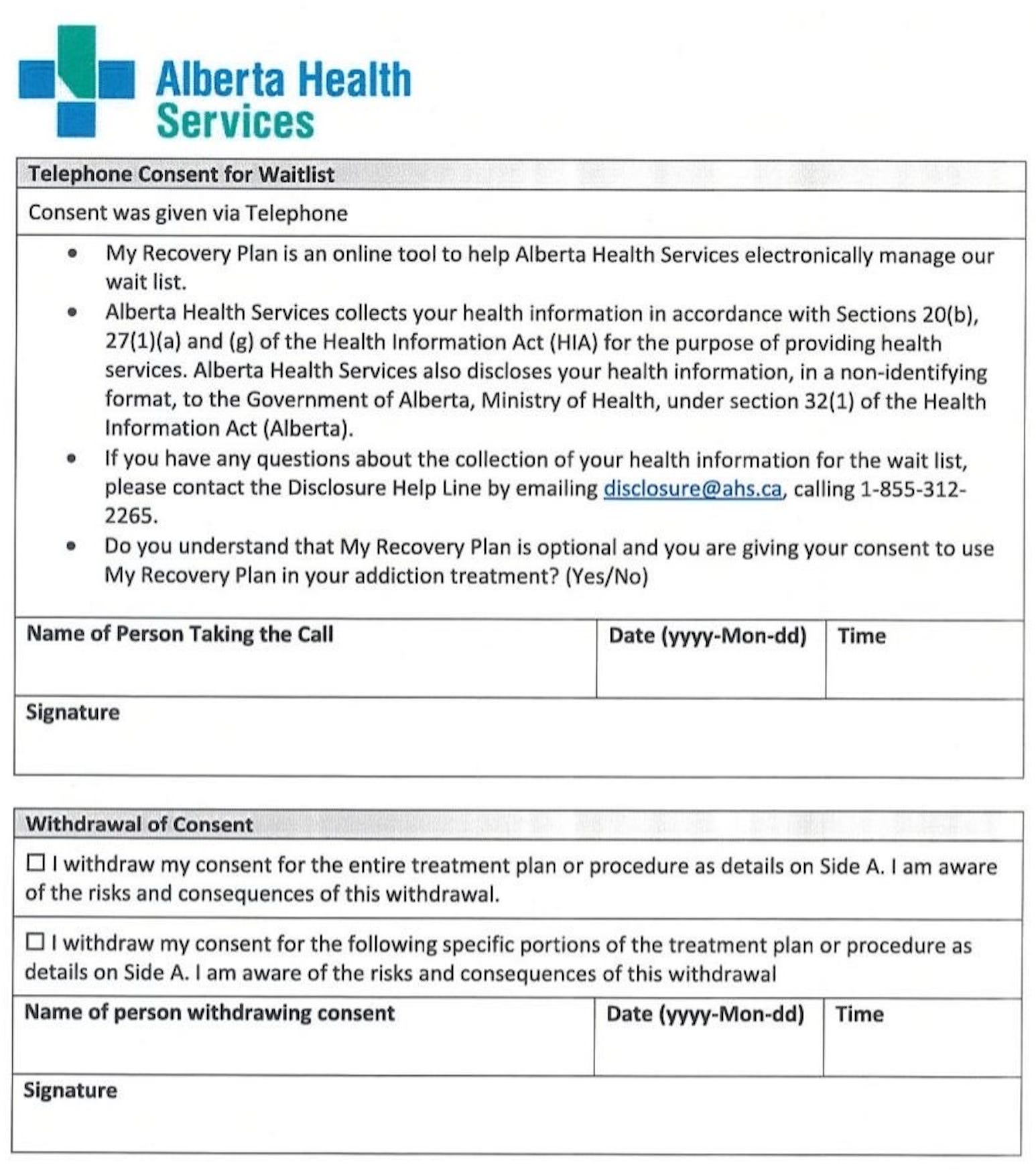 To compare this Ministry statement with the treatment facility intake process, I obtained a waitlist intake form from a detox facility run by Alberta Health Services (AHS). It details the consent process for enrolling in My Recovery Plan, and indicates that an individual's health information is provided to Alberta Health (the government ministry, distinct from AHS) in a non-identifying format. For those who decide not to share information through My Recovery Plan or not to proceed with treatment services, the form indicates “risks and consequences.”