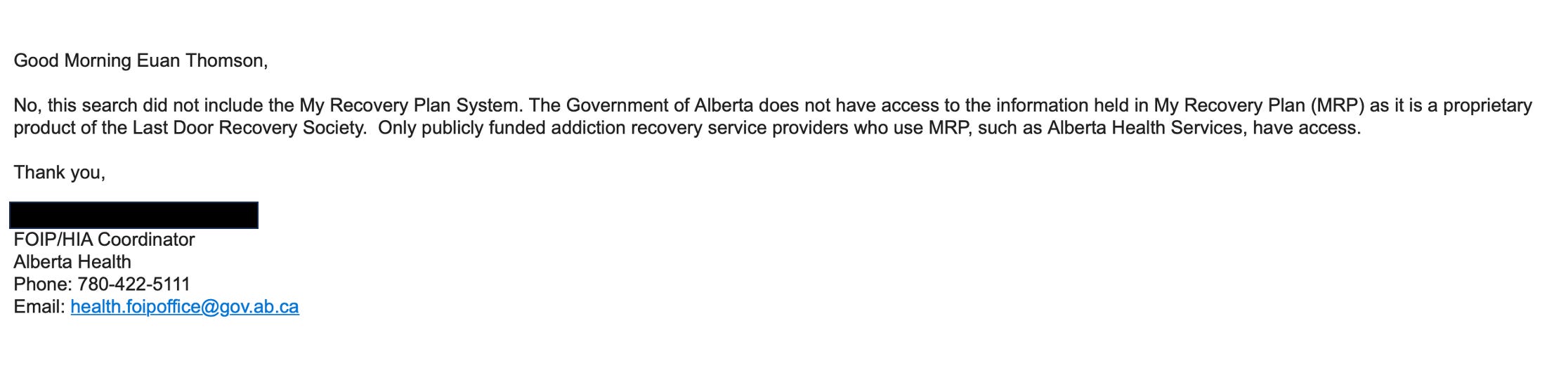 "No, this search did not include the My Recovery Plan system. The Government of Alberta does not have access to the information held in My Recovery Plan (MRP) as it is a proprietary product of the Last Door Recovery Society. Only publicly funded addiction recovery service providers who use MRP, such as Alberta Health Services, have access.”