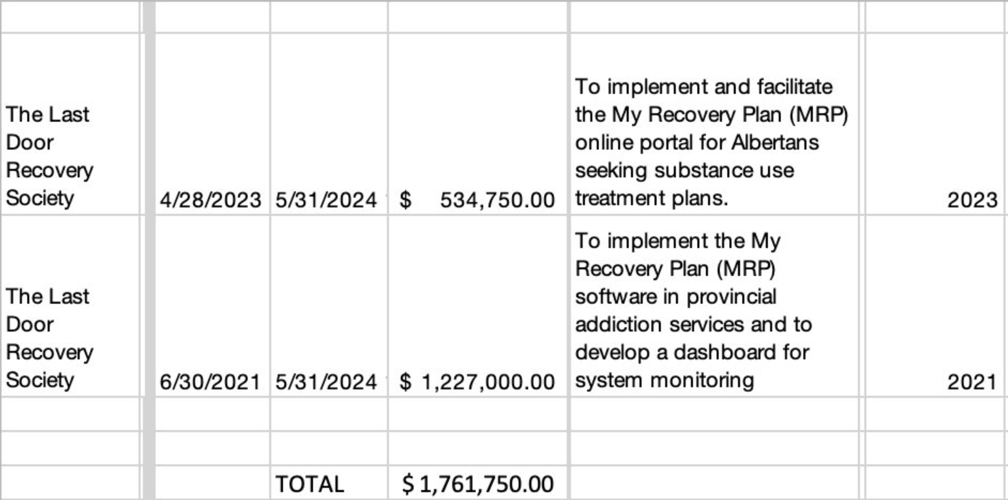 Starting in June 2021, the Alberta government provided sole source contracts totalling $1,761,750 to Last Door Recovery for My Recovery Plan. The first contract disclosure states that Last Door would “develop a dashboard for system monitoring.” However, the second contract drops the term “system monitoring,” specifying instead an “online portal for Albertans seeking substance use treatment plans.” This discrepancy suggests that if plans existed to publicly disclose evaluation metrics on treatment, such as reasons for early discharge, they may have been abandoned in the period between the two contracts.