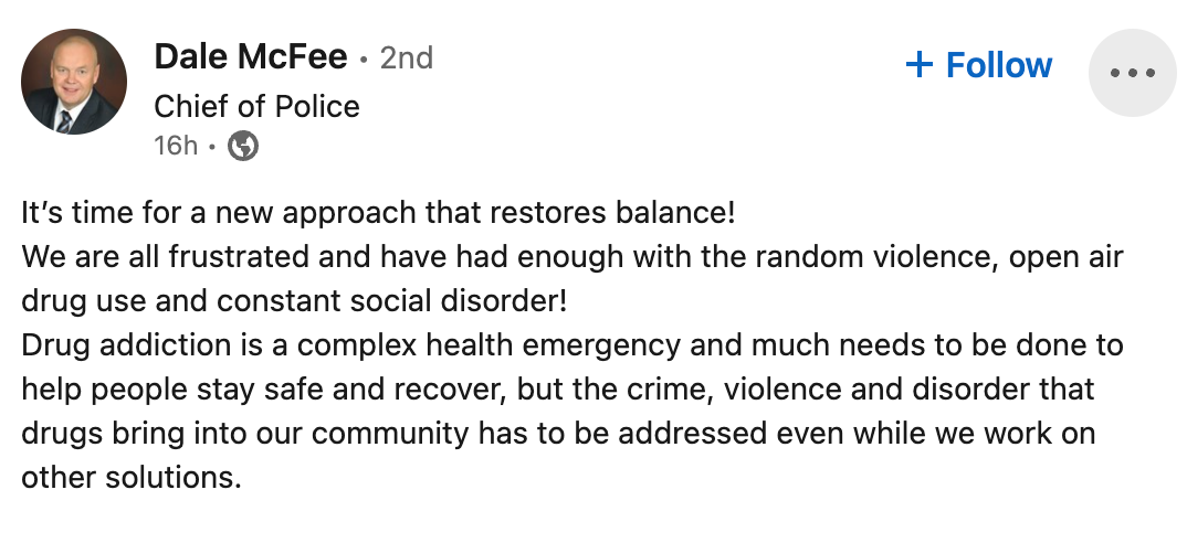 Will McFee admit his broken war on drugs has failed and that it is time for a new approach that centres people and acknowledges the harms of policing in the context of criminalized drug use?