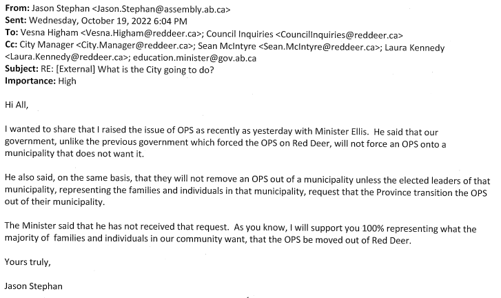 This suggests that the conversation between MLA Stephan and Councillor Higham, which was redacted in the City of Red Deer's response weeks after the fateful vote, is now being made public as a result of the decision by the Alberta government to close the overdose prevention site. In other words, the conversation may have been redacted because the Alberta government had not yet sealed the fate of the site.