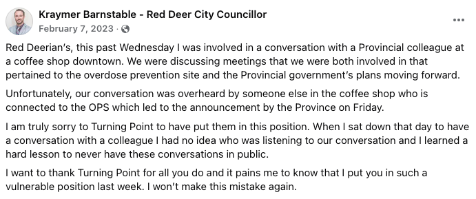 This is not, however, the first time a sitting Red Deer city councillor has been observed agitating for the closure of the site at the provincial level. Further complicating Higham's response, on February 1, 2023, Councillor Kraymer Barnstable was compelled to publicly apologize after he was overheard discussing "the overdose prevention site and the Provincial government’s plans moving forward" with a "provincial colleague." Barnstable did not participate in the February 2024 vote on Higham's motion to ask the Province to close the site.