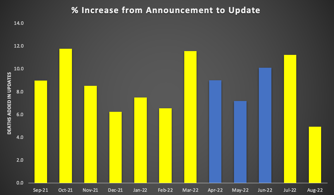 When we look back at the media reports published between September 2021 and August 2022 (I was unable to find media reports for April, May and June 2022, so used my spreadsheet logs from that period), the average increase in mortality each month between announcement and updates is 9%.