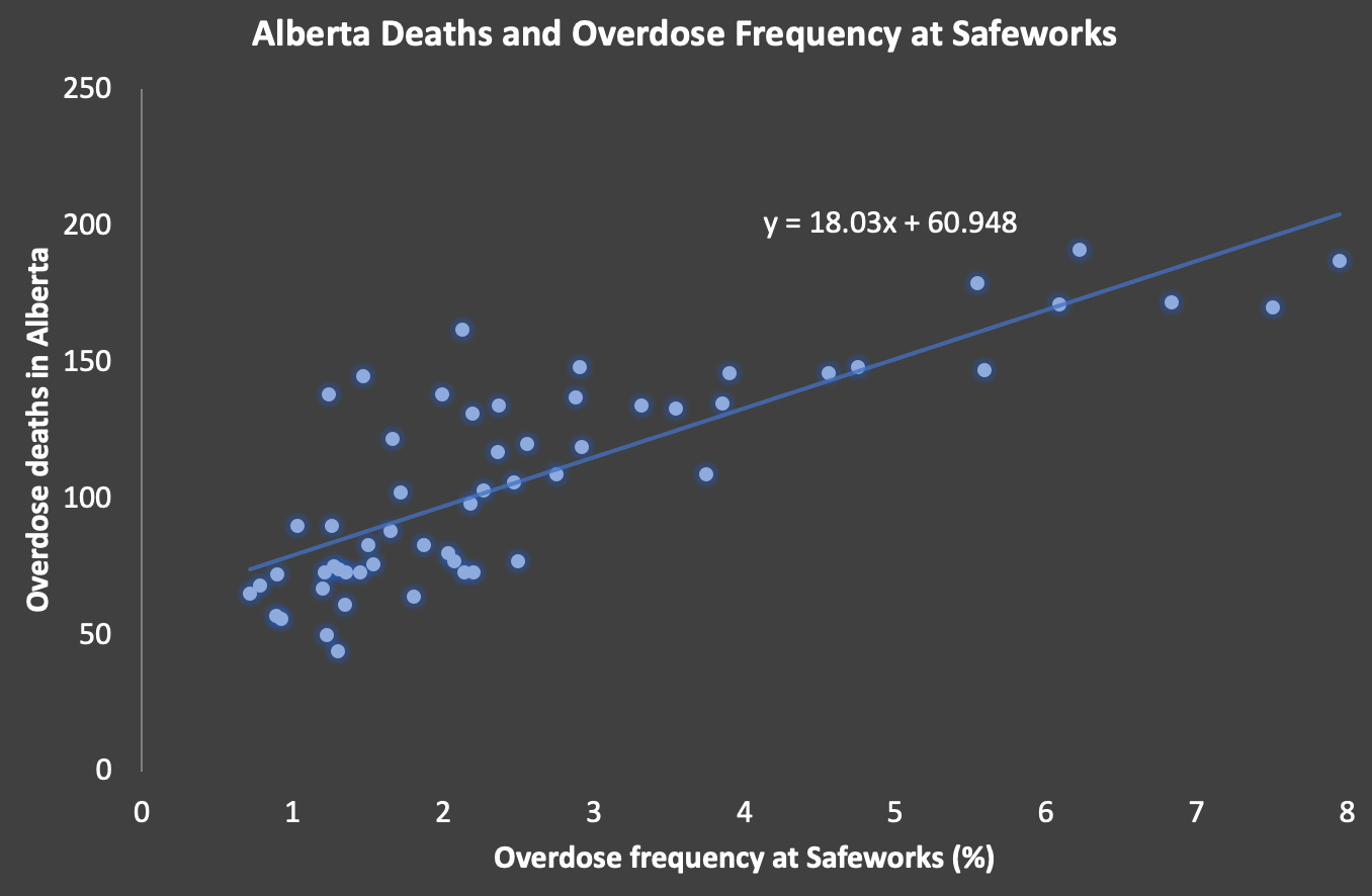 Repeat the same analysis swapping Calgary mortality out for all of Alberta yields a similar result. This indicates that the drug supply accessed by Safeworks’ >3,000 monthly visitors is reflected across the province.